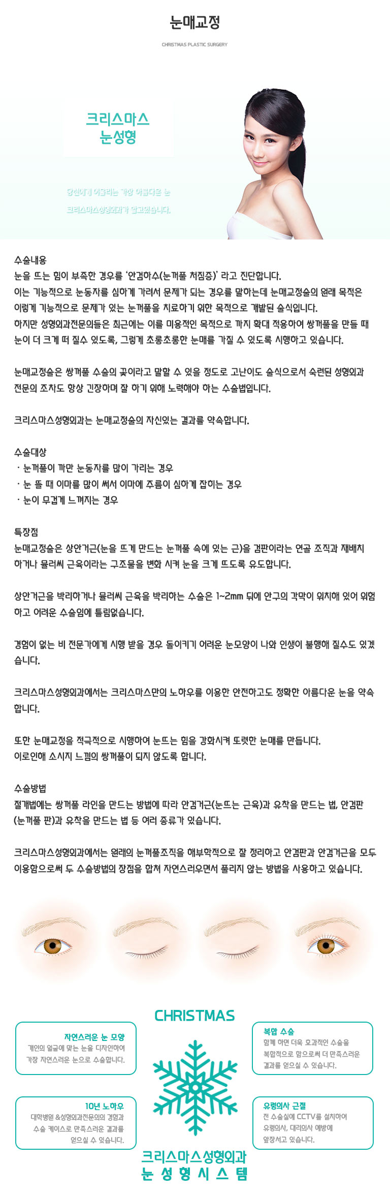 눈가 교정 수술에서 선택할 때 가장 중점적으로 봐야 할 사항은 자신의 현재 눈 상태를 정확하게 진단하는지 여부와 눈가 교정의 다양한 증상을 다뤄봤는지 집도의에 대한 점검입니다.특히 수술 집도의 경험과 경력, 수술 방법, 노하우는 정확하게 상담을 진행하면 충분히 알아차릴 수 있습니다.
