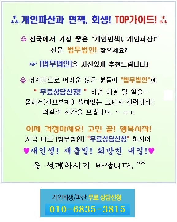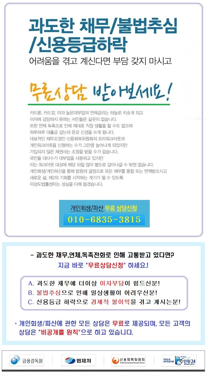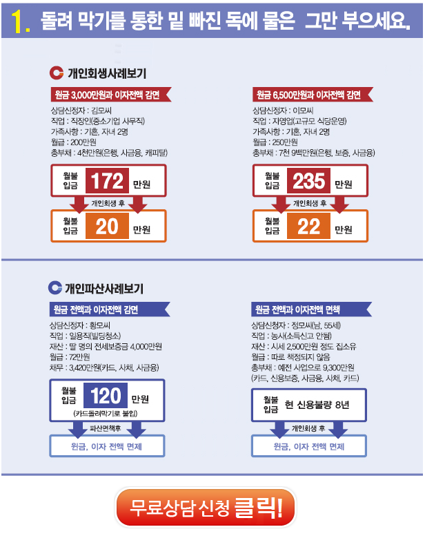 다행히 모든 채무는 회사를 통해 조정이 가능해 고정수입을 유지할 수 있어 전 과정이 안정적이고 경력도 명확해서 결정권을 받을 수 있다. 인생에서 위기는 누구에게나 찾아올 수 있지만 어떻게 대처하느냐에 따라 미래가 바뀔 수 있기 때문에 무엇보다 유연하게 대처하고 함께 살고자 하는 의지를 꺾지 않는 것이 중요합니다. -서울특별시 개인회생.