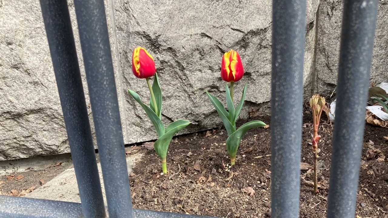 오늘은 뭔가 달랐다. 나는 무언가가 지나가는 것을 느꼈다. 무엇? 무엇? 좌우를 살펴보았으나 바로 보이지 않았다. “미주알 고주알… 이것저것…” 누군가 대화를 듣고 있었고, 좁은 바닥에 한 손 뼘도 안 되는 간격으로 튤립(?) 두 송이가 서 있었다.