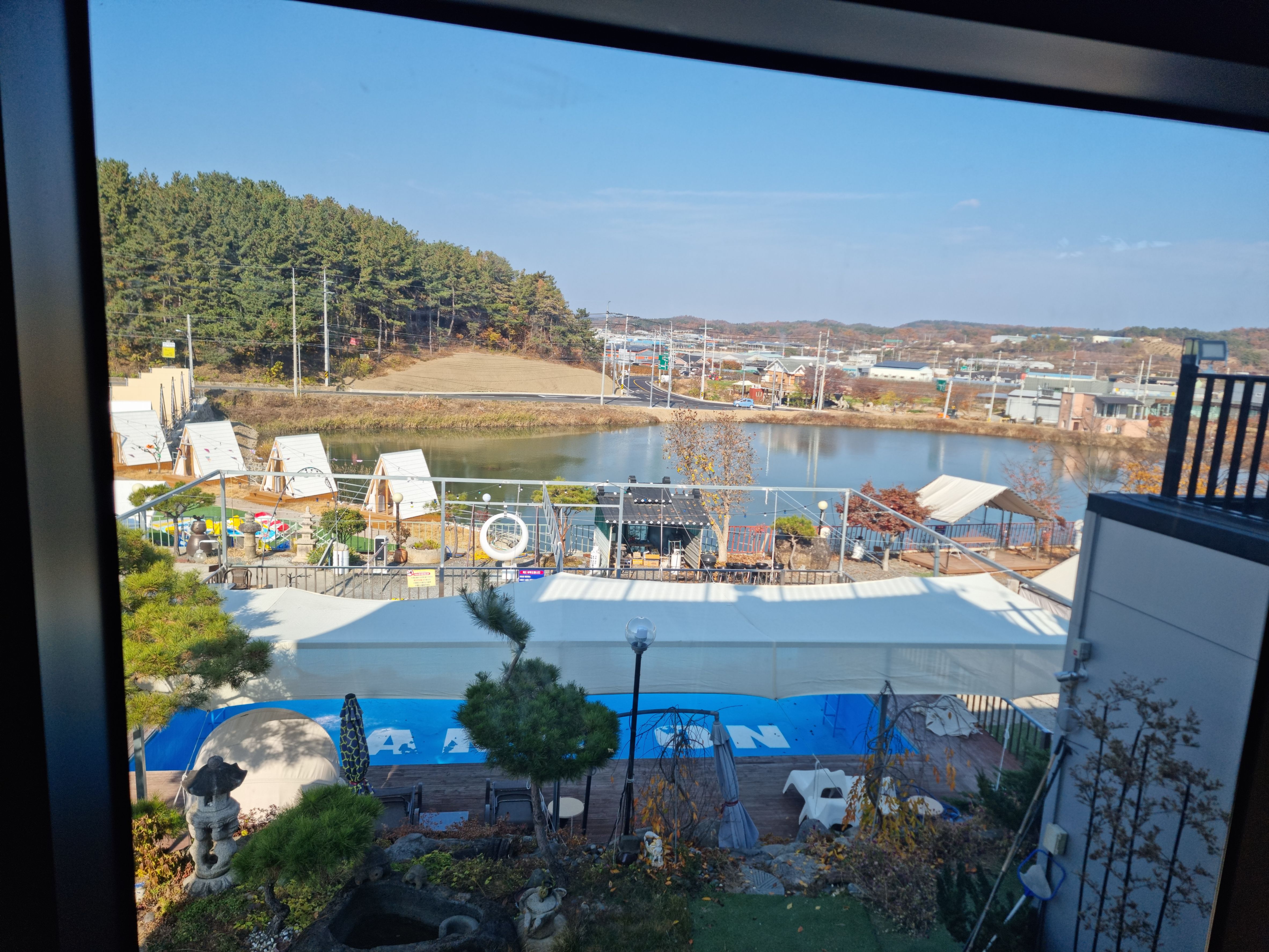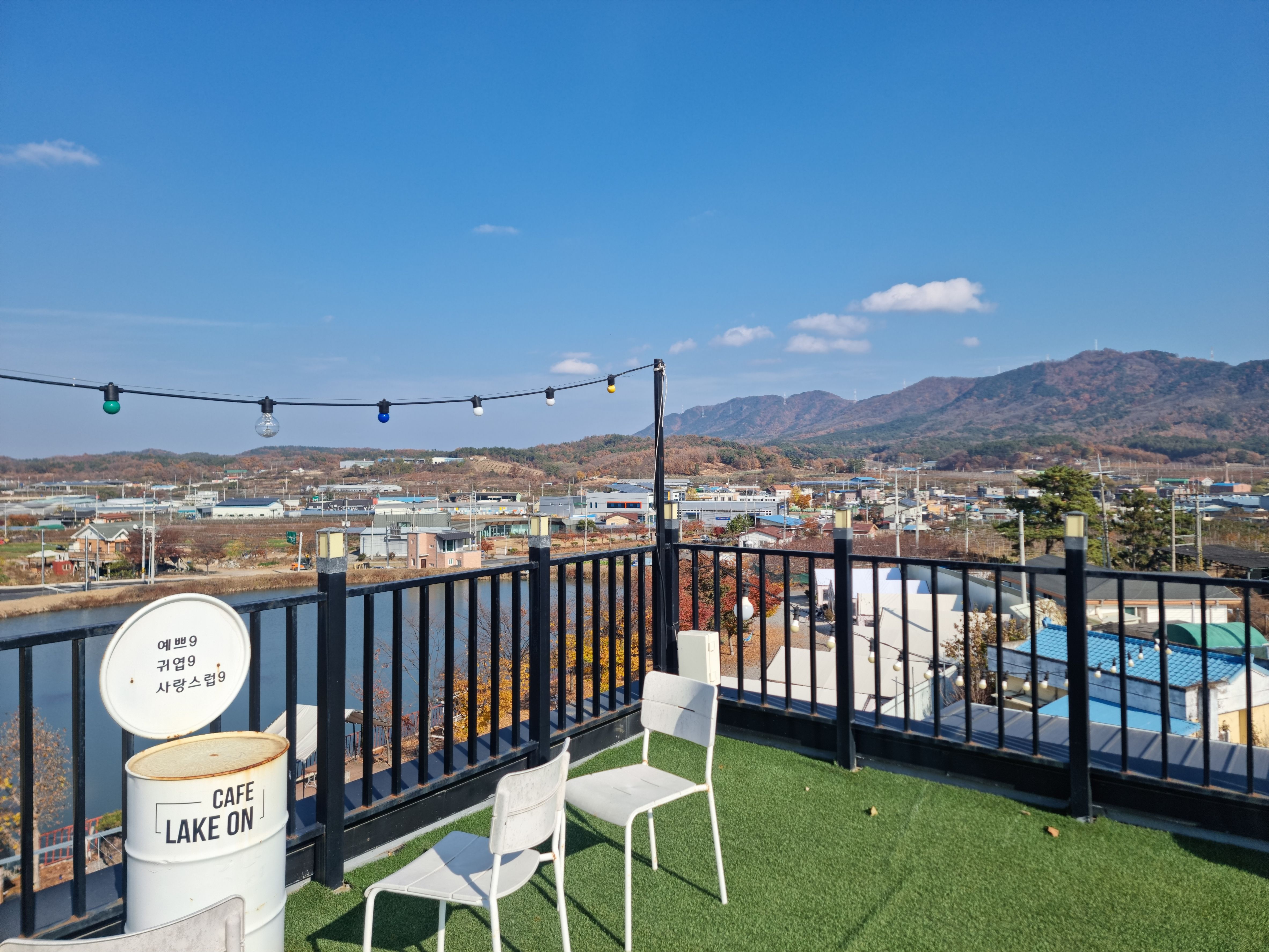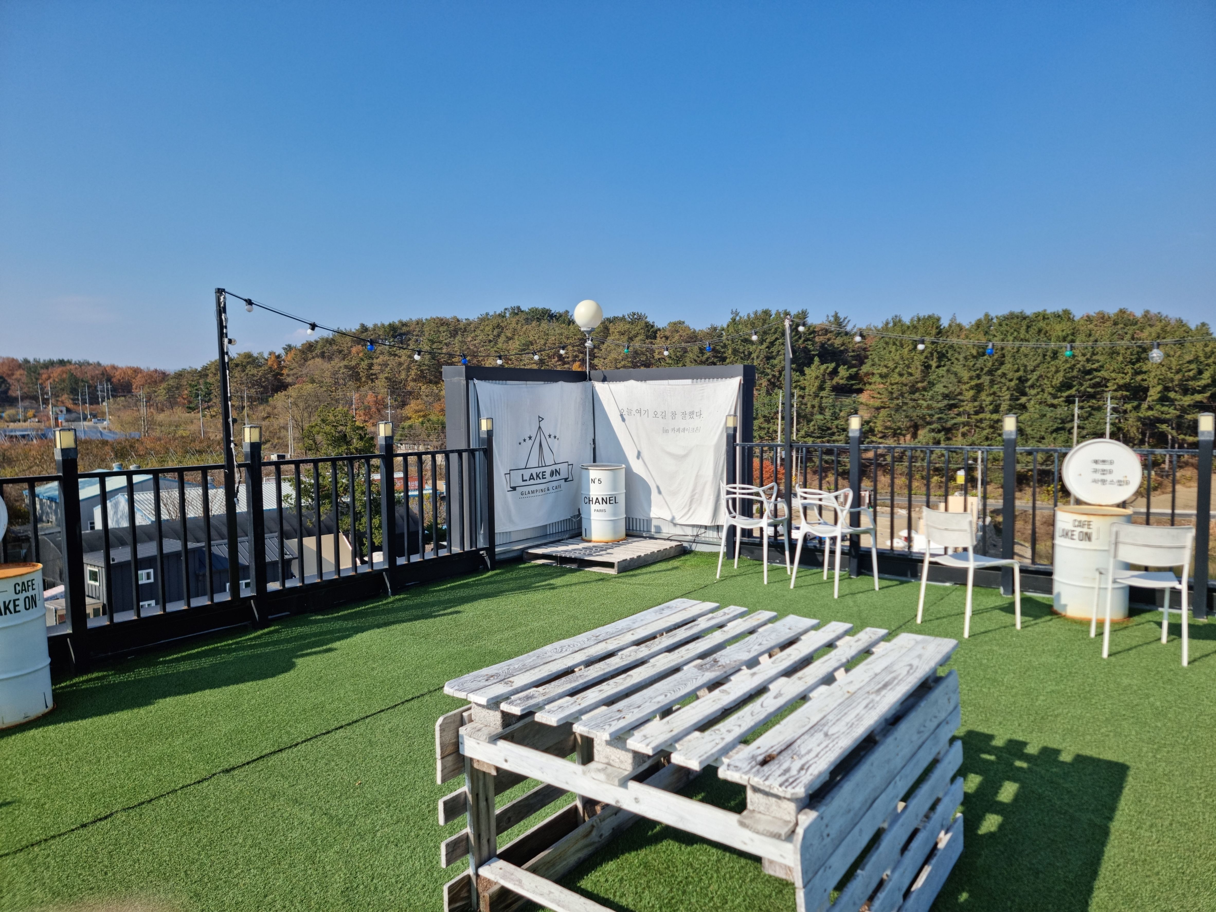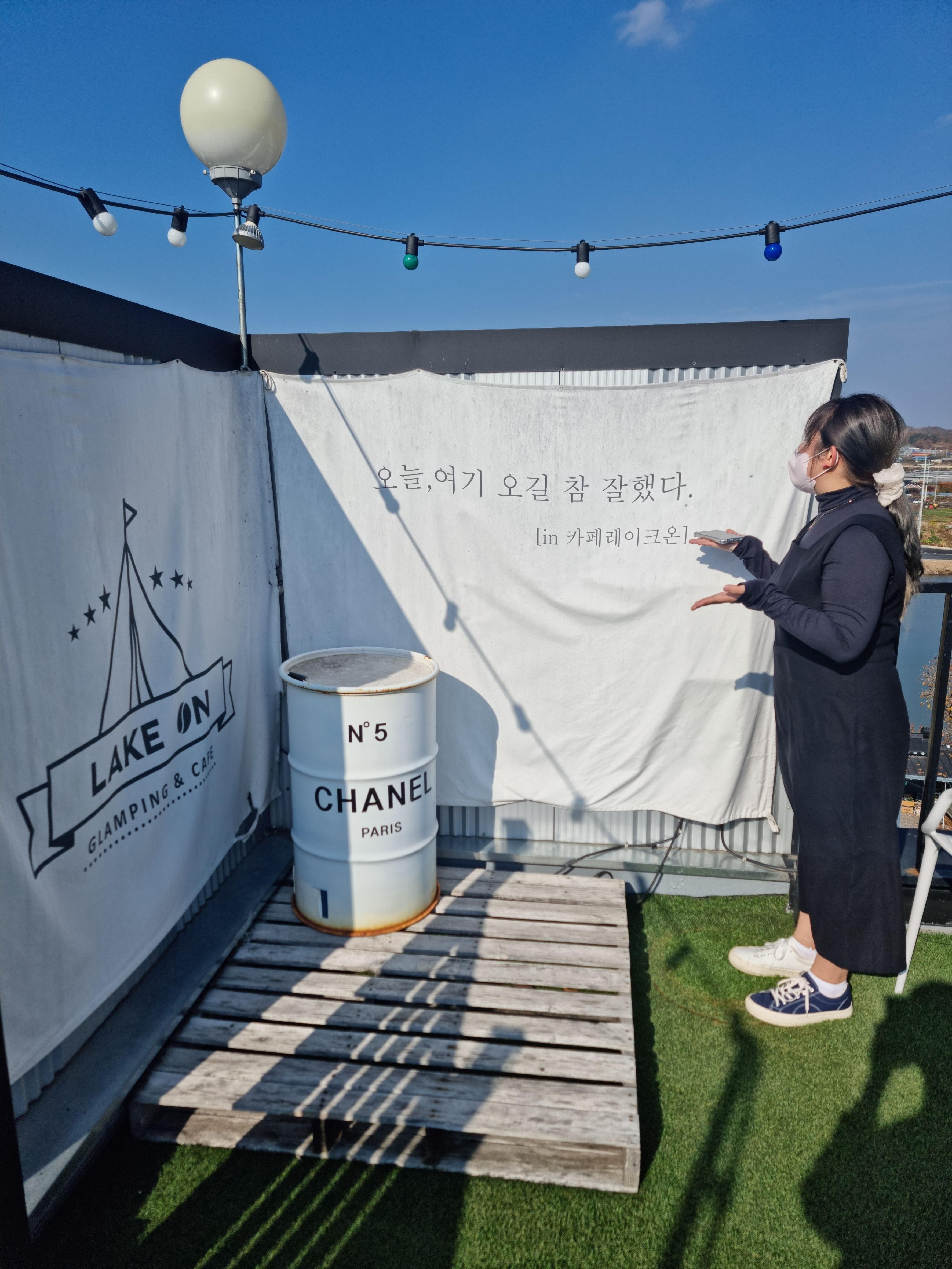 그냥 카페가 아니라 캠핑장 스타일의 글램핑 카페입니다. 마치 강에서 낚시를 하는 것 같습니다.