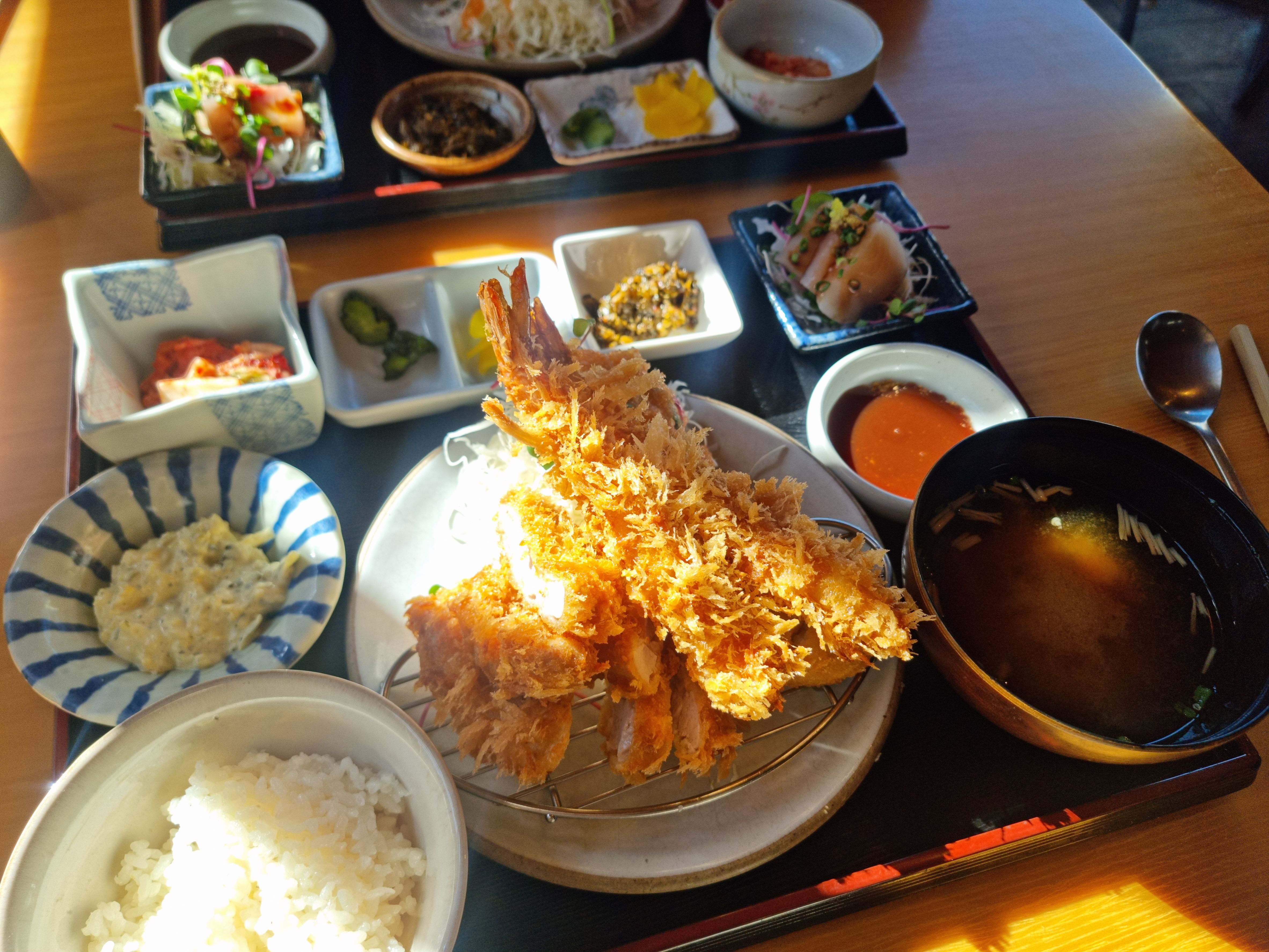 샐러드가 나오고 카츠에 새우튀김이 나옵니다. 이 장식? 그것은 사라 졌어요