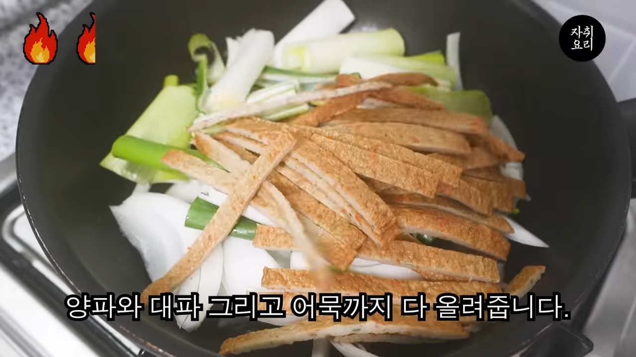 먼저 팬에 양파, 대파, 어묵을 볶는다.