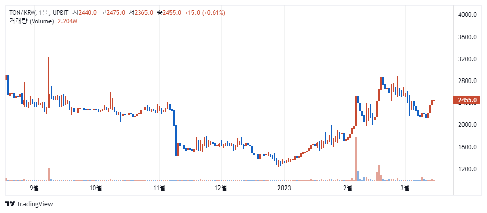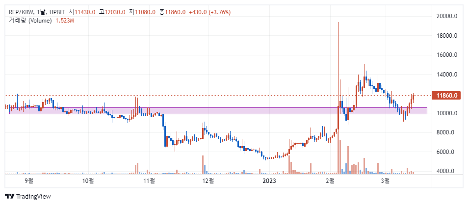 2월 초 박스 터치 후 거래량이 20,000원 가까이 급증한 후