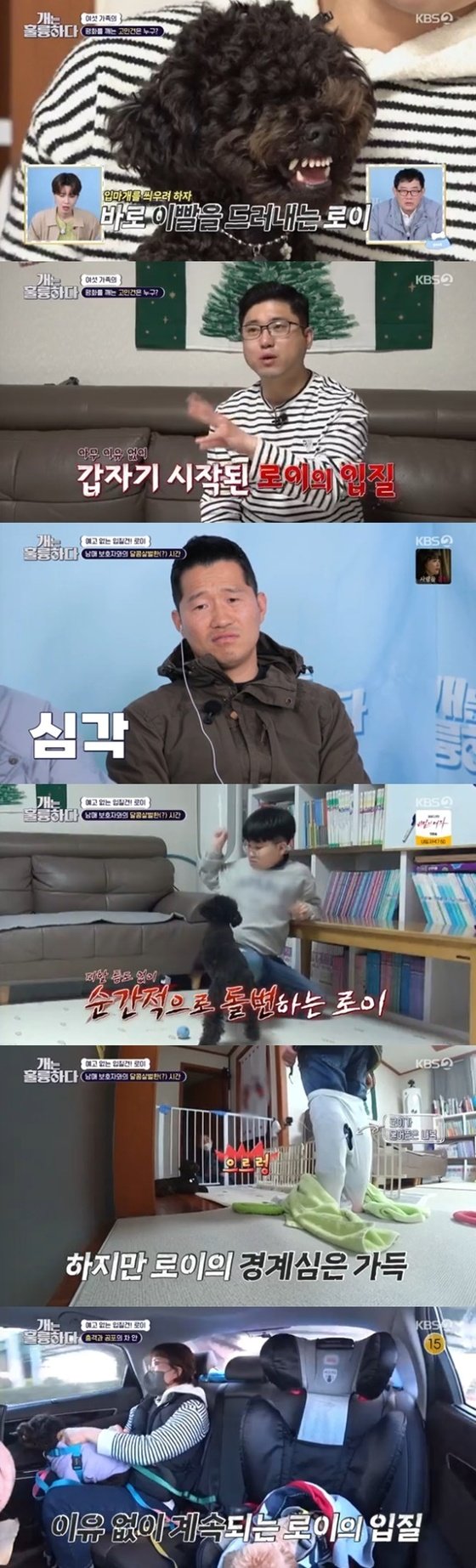시시각각 변덕을 부리며 가족을 공격하는 ‘변덕스러운 개’ 로이에게 화가 난 도연은 “아! 이 XX’는 격렬한 분노(?)를 표출하고 있다. 대통령령 코치 강형욱도 로이의 무자비한 입질에 저주를 풀지 못했다.